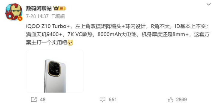 根据之前iqoo z系列产品的定位,确实会有这么一款Turbo+产品,上一代iqoo z9 Turbo+的出现就惊艳了中端市场,定价2299元的天玑9300+手机很有性价比,如今迭代的iqoo z10 Turbo+依然会延续这个优势,定价在2299元还是很极致的。